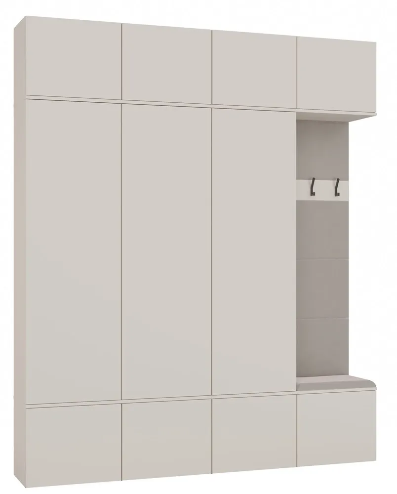 Zestaw HAGA IV 3SZ1W to propozycja dla tych, którzy potrzebują więcej przestrzeni do przechowywania, nie rezygnując z nowoczesnego wyglądu. To gotowe, kompletne rozwiązanie do przedpokoju, łączące 3 pojemne szafy z drążkiem i półkami oraz moduł z wieszakiem, tapicerowanym siedziskiem i szafkami.
