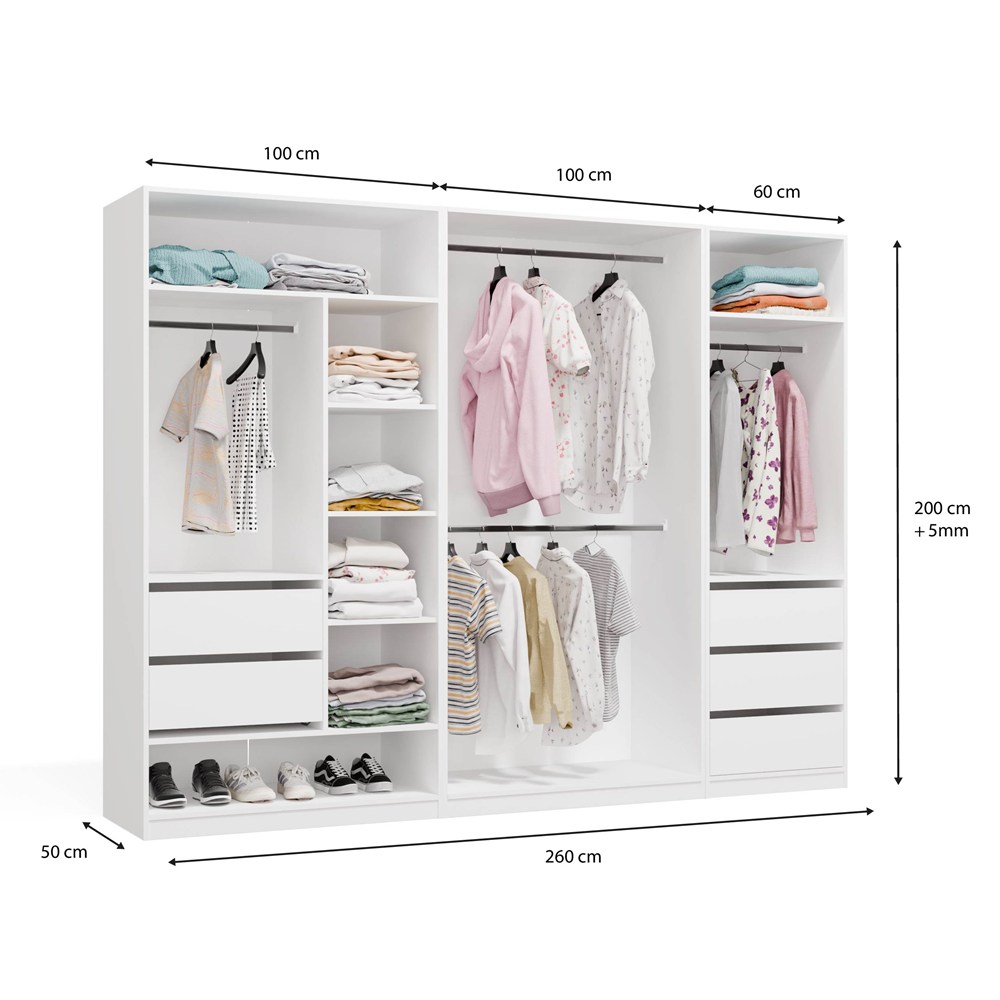 OPENO ZESTAW 260x200 to kompletny system garderoby, który pozwala stworzyć funkcjonalną i estetyczną przestrzeń do przechowywania ubrań.