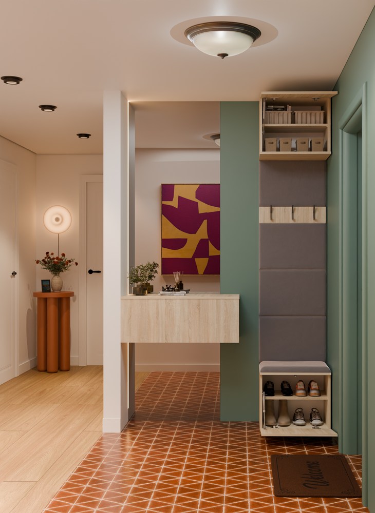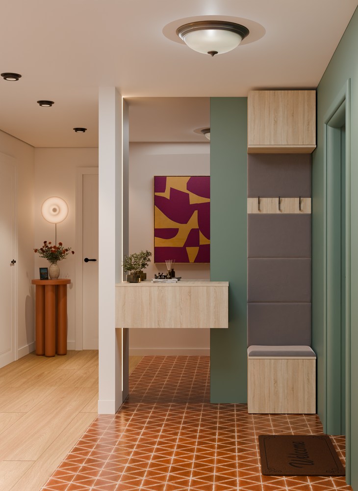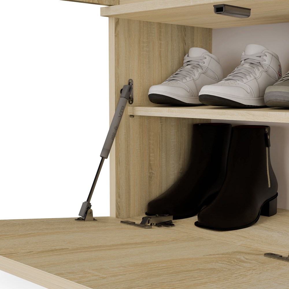 Zamiast klasycznej zabudowanej szafy, model ten wyposażono w otwarty wieszak z haczykami, który pozwala na szybki dostęp do kurtek, toreb czy plecaków. Dzięki temu mebel sprawdzi się zarówno w małych wnętrzach, jak i w przestronnych holach, gdzie liczy się funkcjonalność i optyczna lekkość.