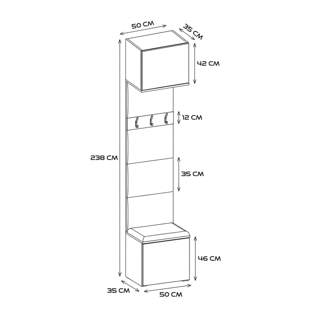 HAGA 1W to kompaktowy i funkcjonalny mebel do przedpokoju, który łączy wygodne siedzisko z miejscem do przechowywania, panel z wieszakami na odzież oraz praktyczną szafkę górną.