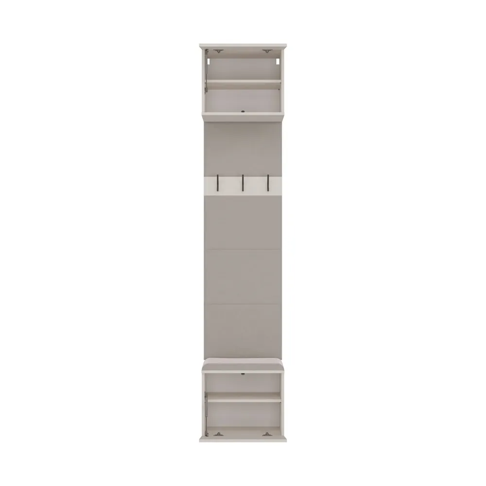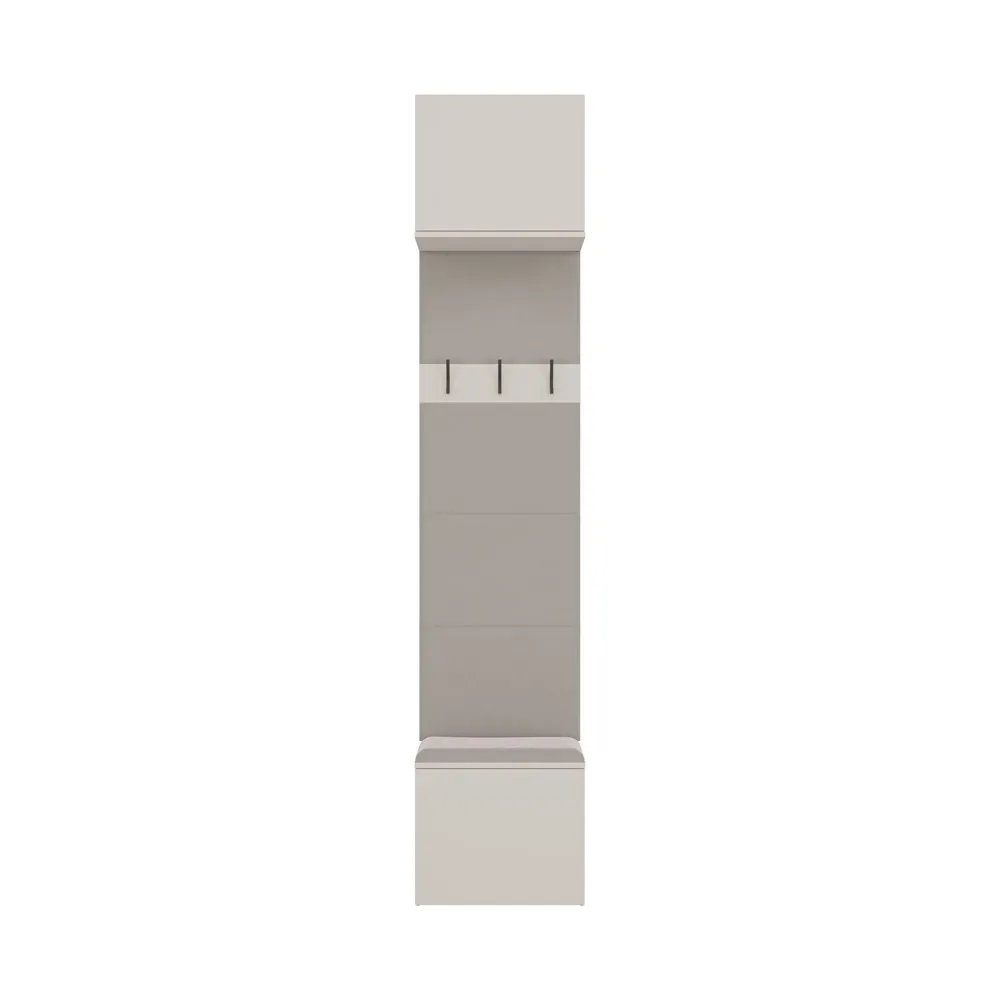 HAGA 1W to kompaktowy i funkcjonalny mebel do przedpokoju, który łączy wygodne siedzisko z miejscem do przechowywania, panel z wieszakami na odzież oraz praktyczną szafkę górną.
