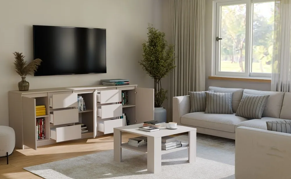 Dokładamy wszelkich starań, aby kolory mebli prezentowane na zdjęciach były odwzorowane możliwie jak najdokładniej. Należy jednak pamiętać, że ich odbiór może się różnić w zależności od indywidualnych ustawień monitora lub ekranu (takich jak jasność, kontrast, temperatura barwowa czy technologia wyświetlania). Rzeczywisty odcień produktu może się także różnić w zależności od warunków oświetleniowych. Ewentualne różnice kolorystyczne nie wynikają z wady produktu.