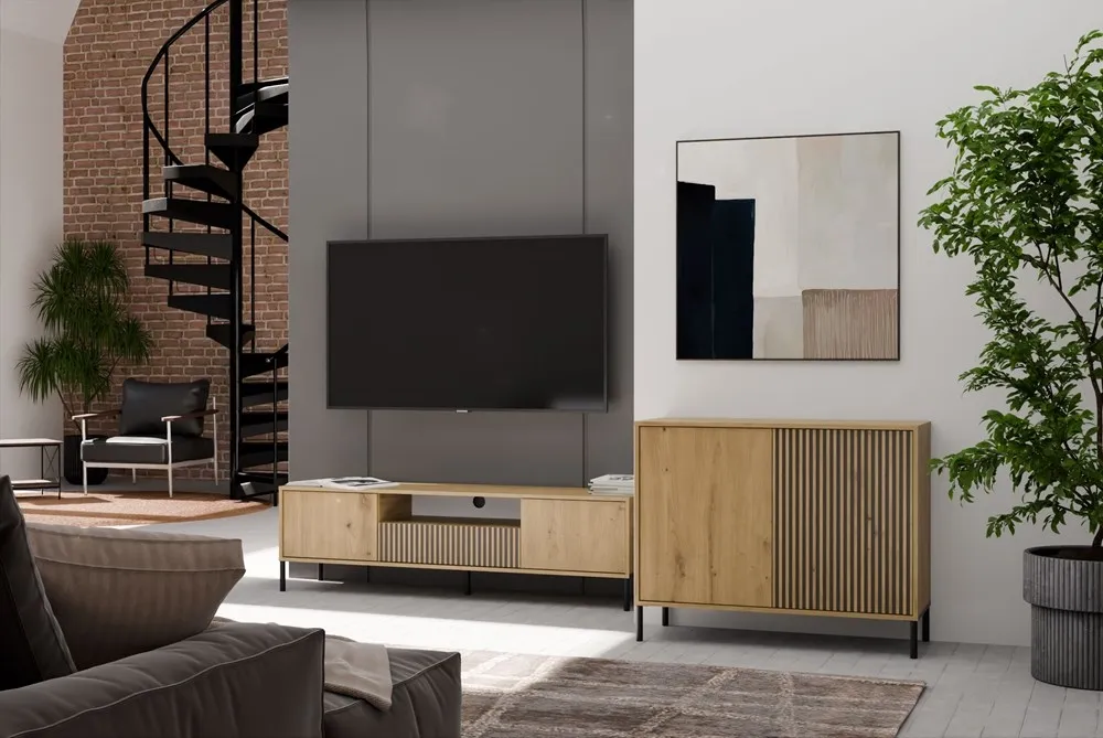 Komoda KAMARO 2D SLIM/GŁADKI DĄB ARTISAN to połączenie estetyki i funkcjonalności, które doskonale odnajdzie się w salonie, pokoju gościnnym, sypialni czy gabinecie. Dzięki ryflowanemu frontowi jednych drzwi (przypominającym lamele), mebel zyskuje nowoczesny i oryginalny wygląd, idealnie pasujący do współczesnych wnętrz.