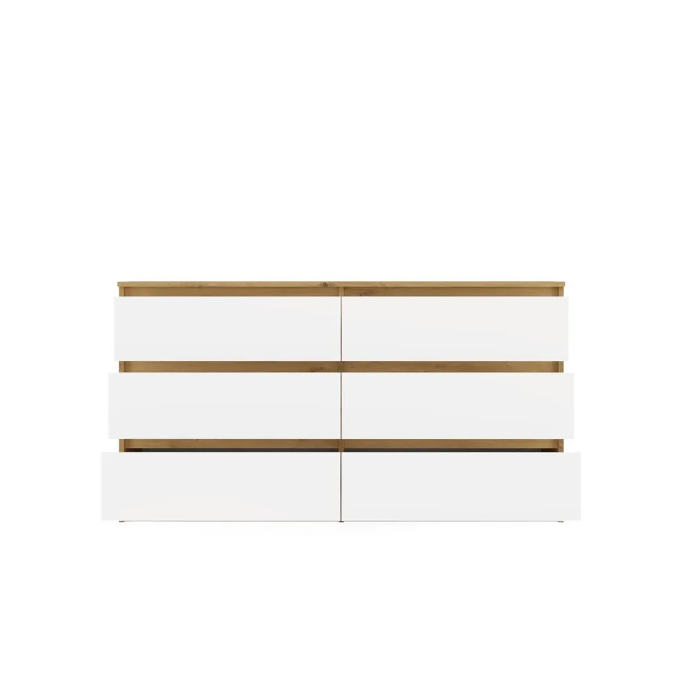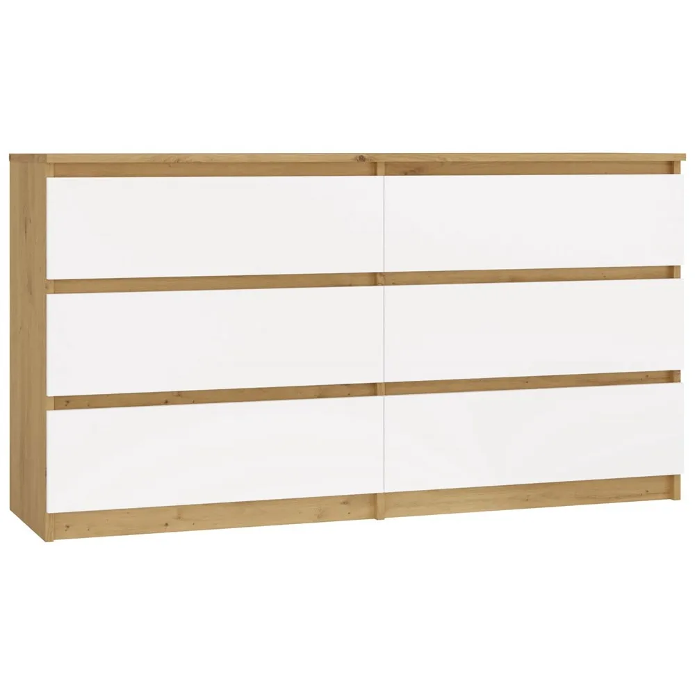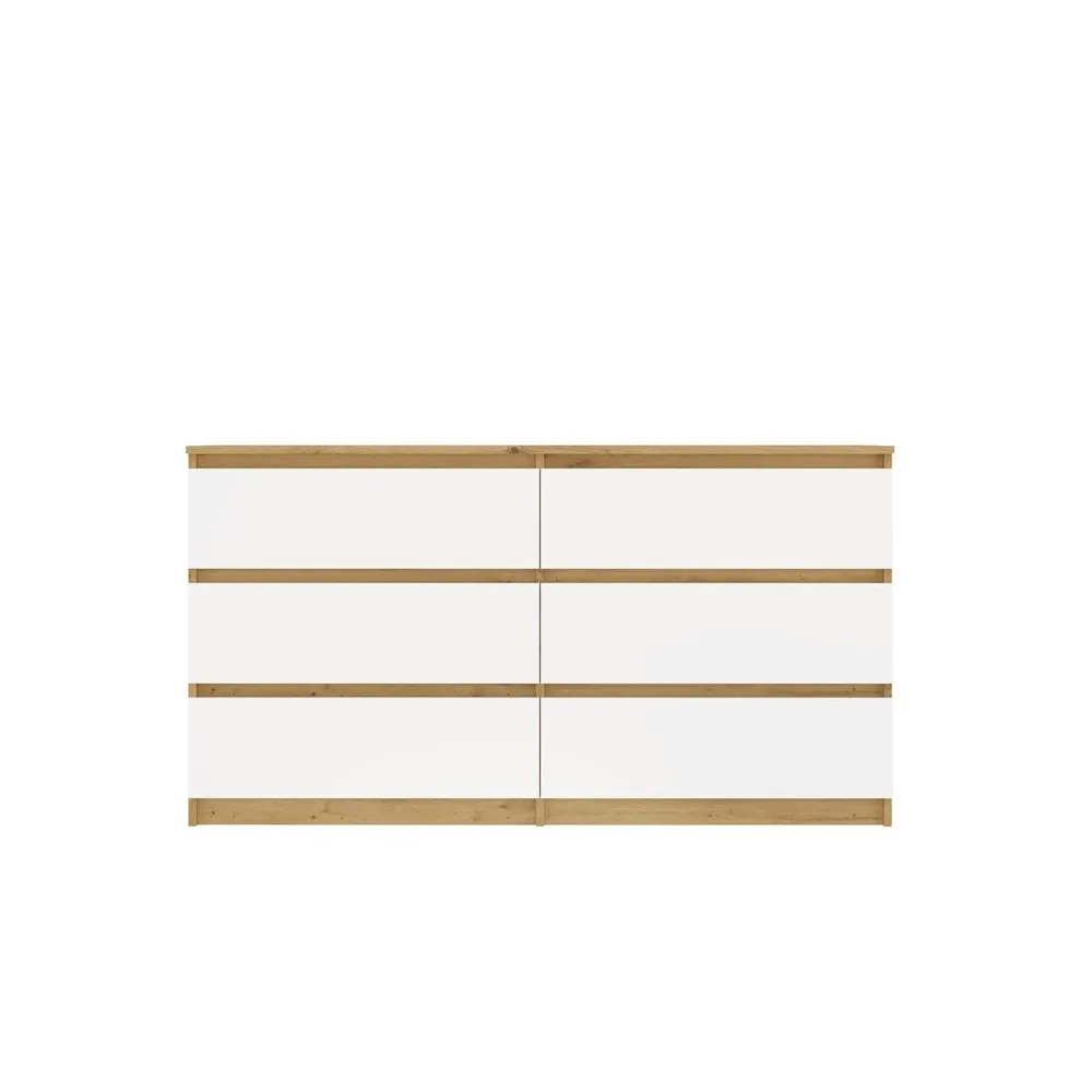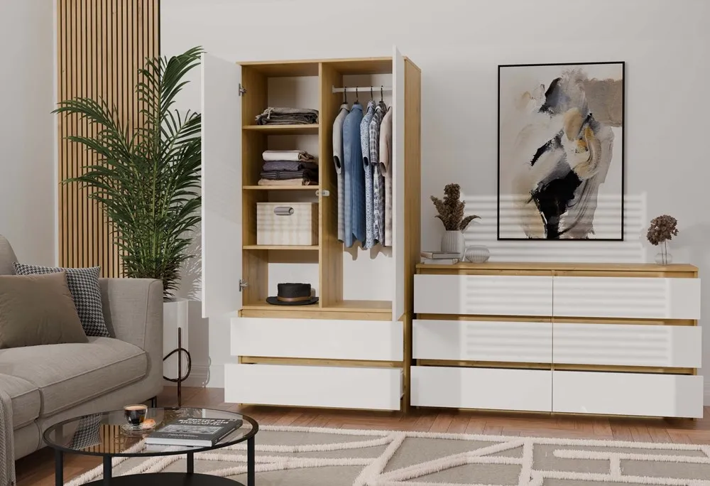 Nowoczesny, elegancki design, który łączy ciepły odcień dębu Artisan z klasycznym białym frontem, nadaje wnętrzu wyjątkowego charakteru. Zestawienie tych dwóch kolorów sprawia, że komoda doskonale komponuje się zarówno w nowoczesnych, jak i bardziej tradycyjnych aranżacjach.