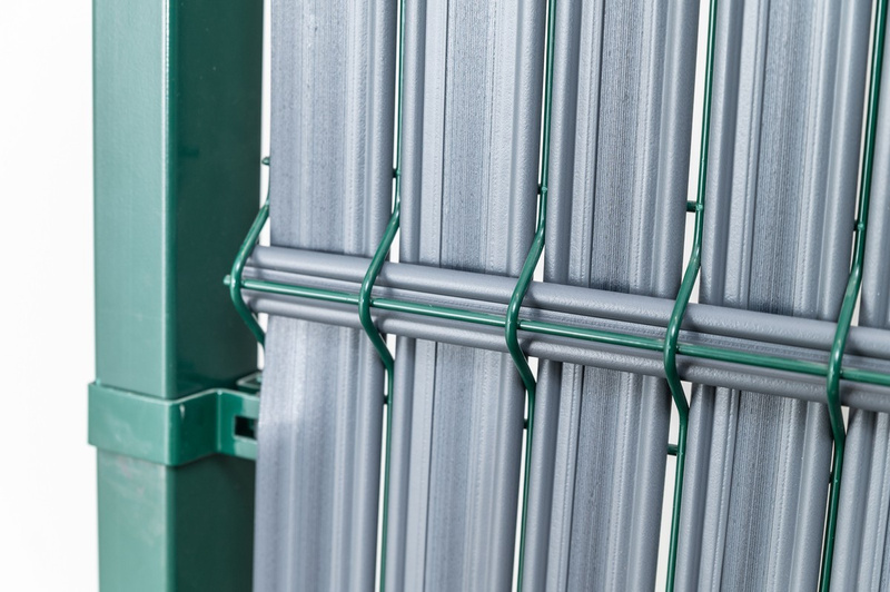 Osłona w postaci listew z tworzywa sztucznego wsuwanych w ogrodzenie panelowe do samodzielnego montażu.