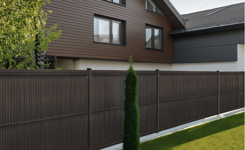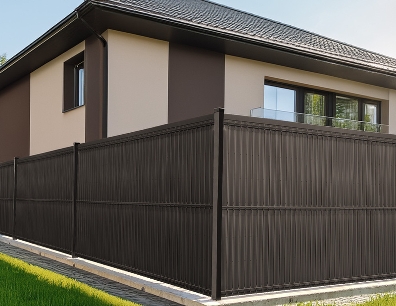 Osłona w postaci listew z tworzywa sztucznego wsuwanych w ogrodzenie panelowe do samodzielnego montażu.
