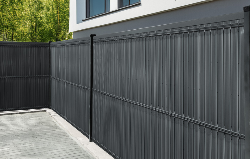 Osłona w postaci listew z tworzywa sztucznego wsuwanych w ogrodzenie panelowe do samodzielnego montażu.