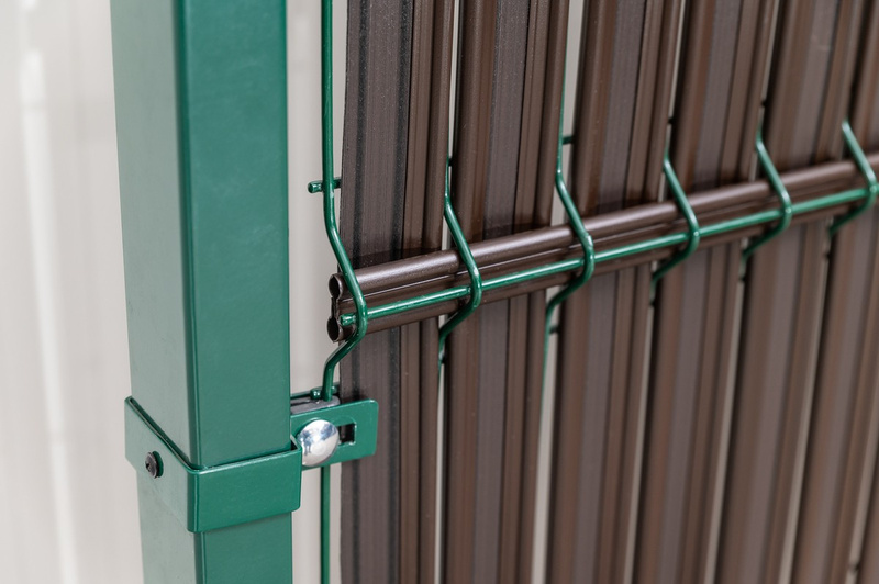 Osłona w postaci listew z tworzywa sztucznego wsuwanych w ogrodzenie panelowe do samodzielnego montażu.