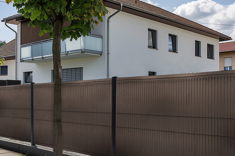 Osłona w postaci listew z tworzywa sztucznego wsuwanych w ogrodzenie panelowe do samodzielnego montażu.