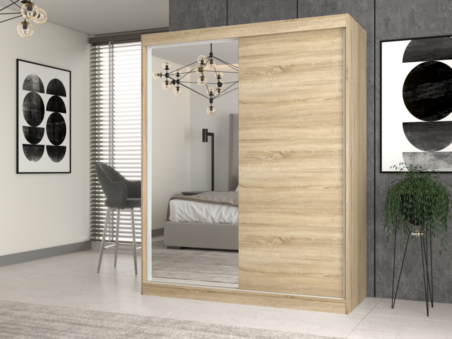Szafa IGA 160 z drzwiami przesuwnymi i lustrem to idealne rozwiązanie do sypialni, biura lub garderoby. Dzięki nowoczesnej kolorystyce i minimalistycznej formie doskonale komponuje się z różnymi aranżacjami wnętrz.