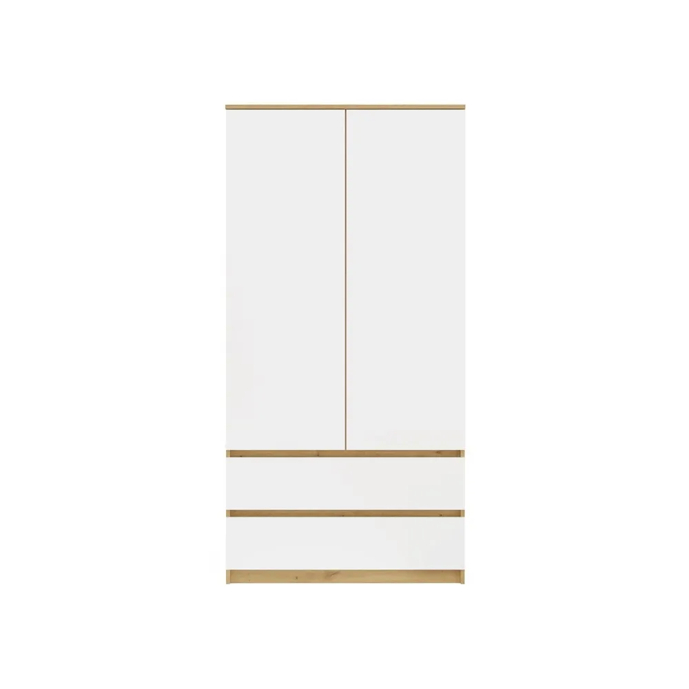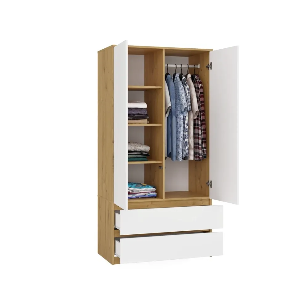 Szafa MALWA SS-90 to nowoczesny mebel, który łączy elegancję z praktycznym podejściem do przechowywania. Dzięki przemyślanej konstrukcji z licznymi półkami, drążkiem na ubrania i dwiema pojemnymi szufladami doskonale sprawdzi się w sypialni, garderobie, pokoju młodzieżowym czy domowym biurze.