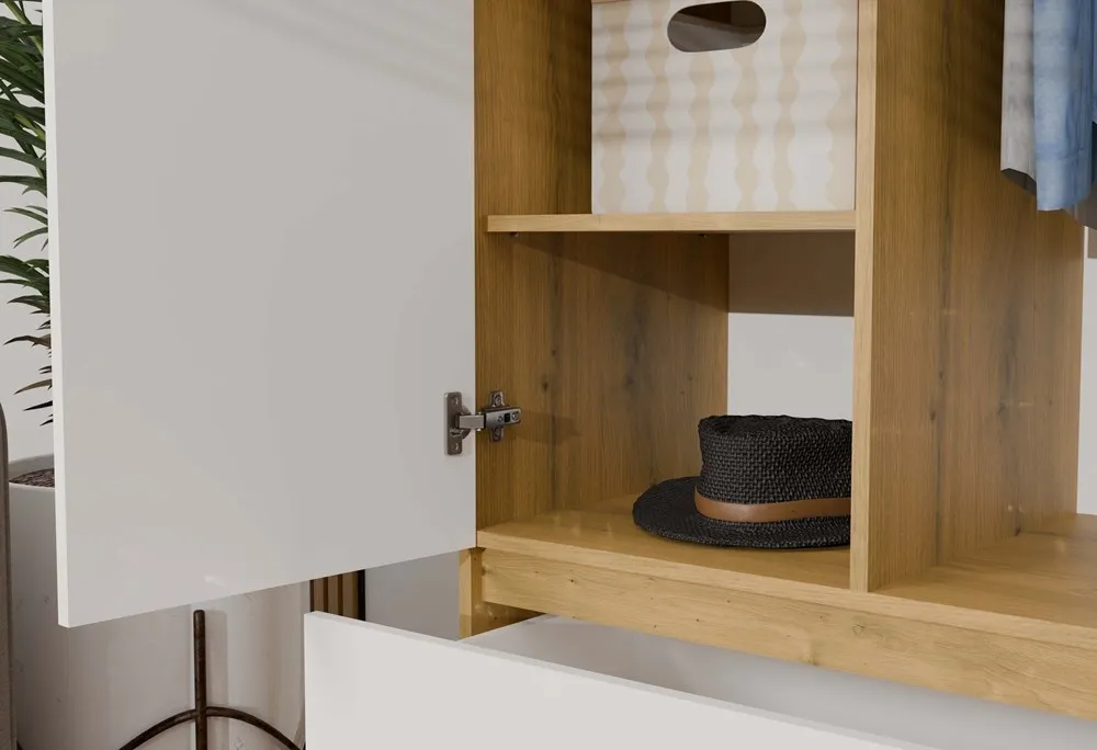 Połączenie ciepłego odcienia dębu artisan z białymi, gładkimi frontami nadaje meblowi lekkości i wpisuje się w najnowsze trendy wnętrzarskie.